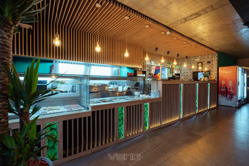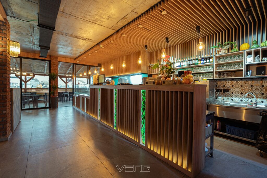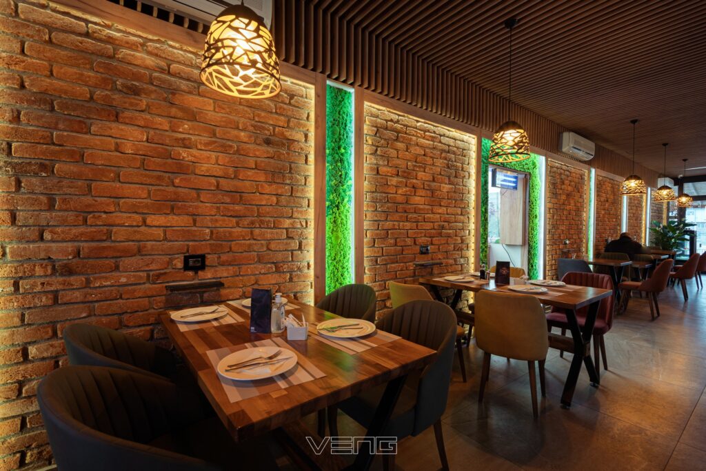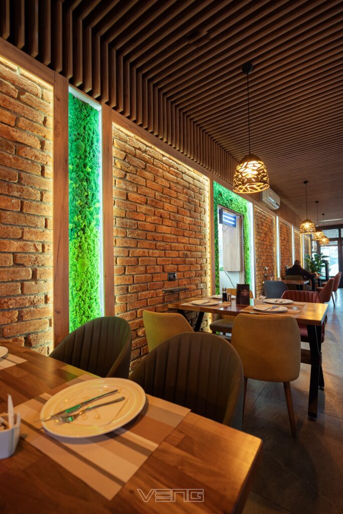 Restaurant Oruçi blends rustic charm with modern design, featuring a cozy yet contemporary atmosphere. Warm wood textures, exposed brick walls, and vertical green elements create a refreshing and inviting environment. Carefully curated lighting and custom wooden ceilings enhance the dining experience, offering a perfect setting for both casual meals and special gatherings.
