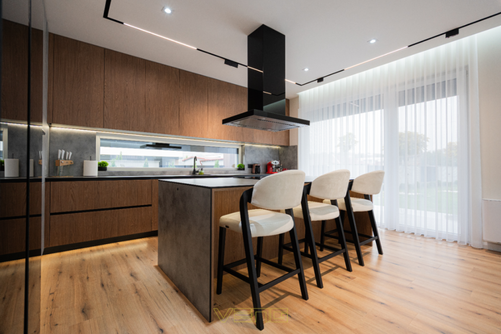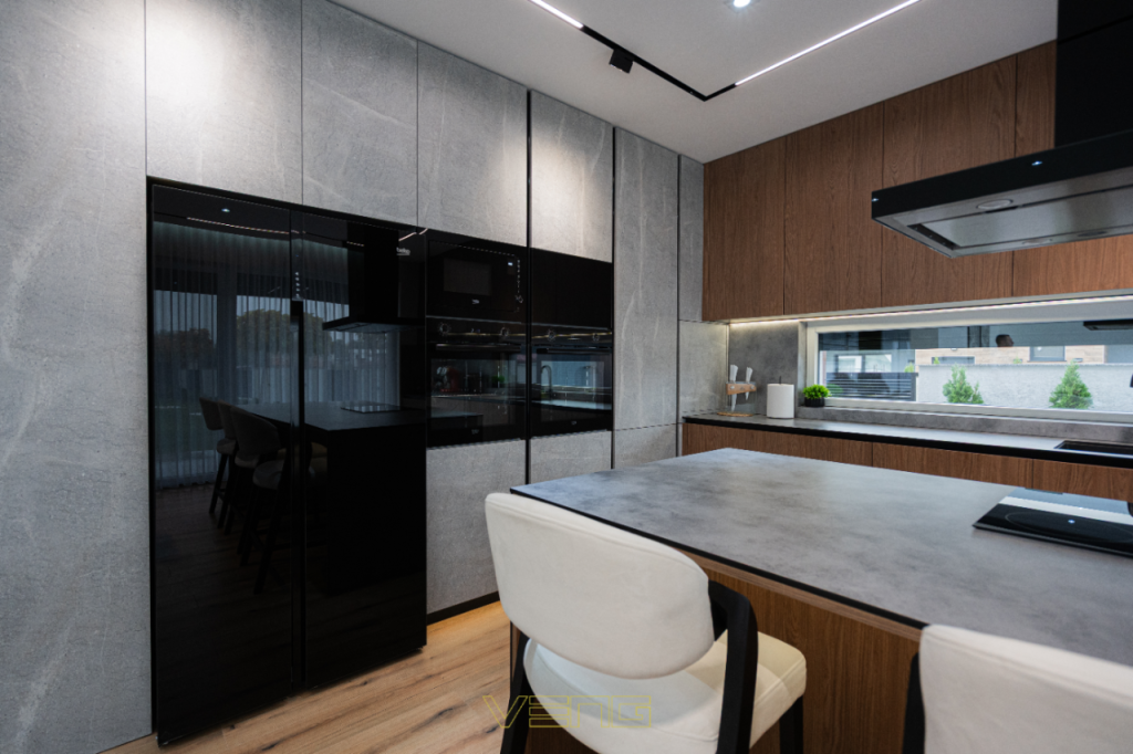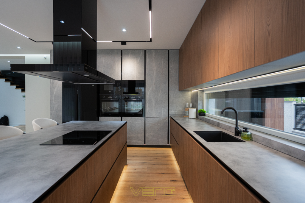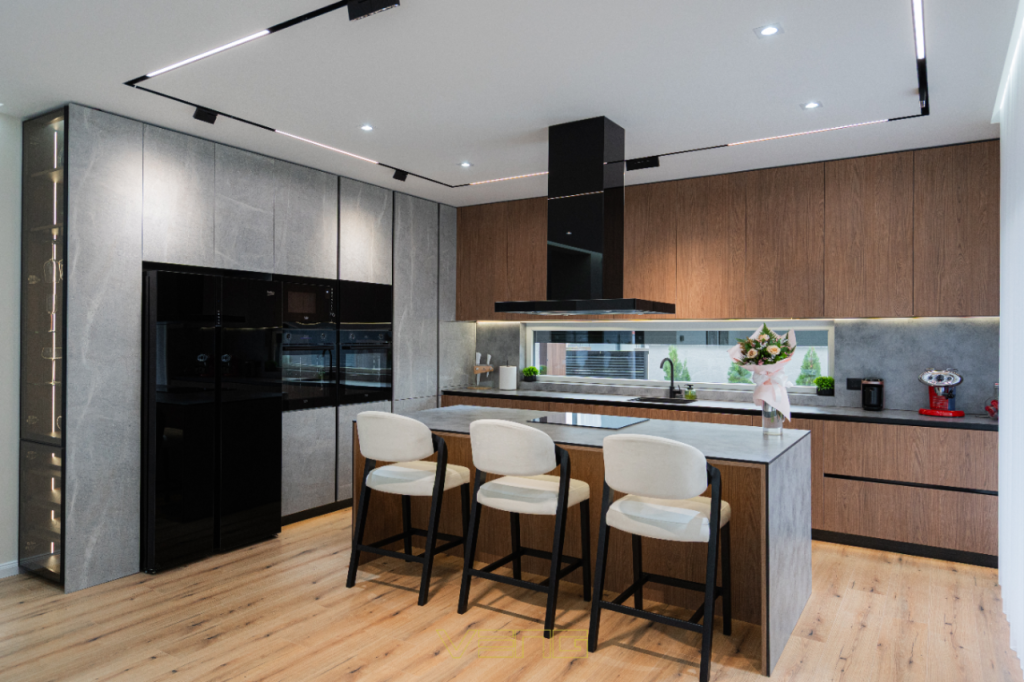 A contemporary kitchen that represents everyday luxury through clean forms and contrasting materials. The blend of natural wood, concrete-gray surfaces, and black details creates a modern, warm, and elegant atmosphere. Horizontal lines, integrated lighting, and a central island make the space functional, welcoming, and visually balanced. Urban Elegance embodies the modern urban lifestyle with a sense of comfort and sophistication.