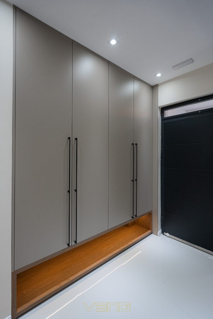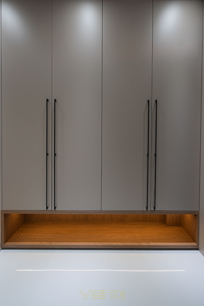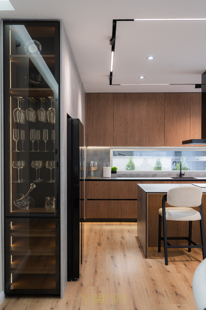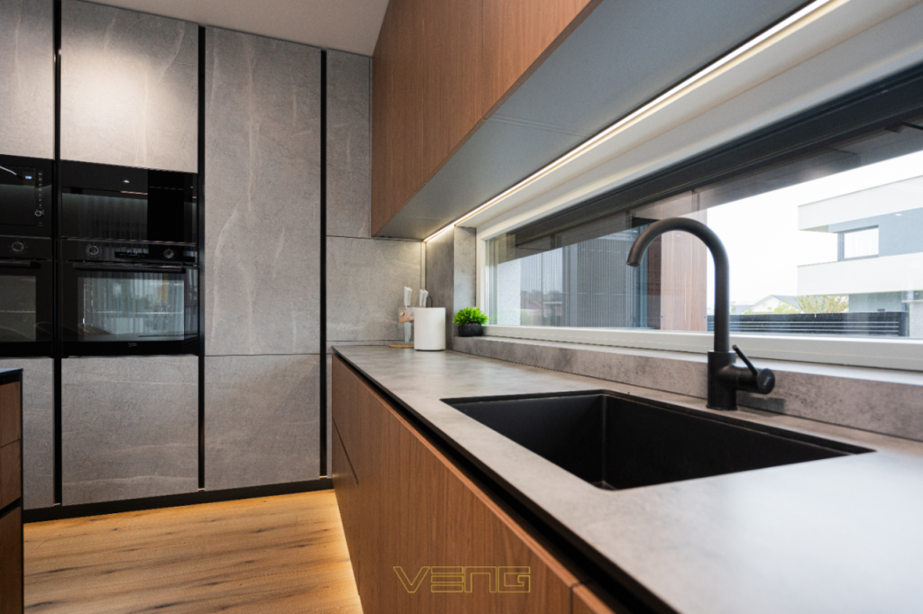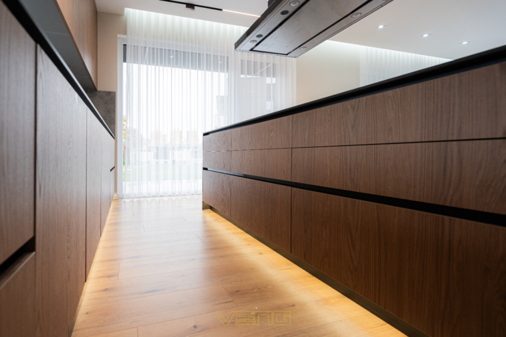 A contemporary kitchen that represents everyday luxury through clean forms and contrasting materials. The blend of natural wood, concrete-gray surfaces, and black details creates a modern, warm, and elegant atmosphere. Horizontal lines, integrated lighting, and a central island make the space functional, welcoming, and visually balanced. Urban Elegance embodies the modern urban lifestyle with a sense of comfort and sophistication.